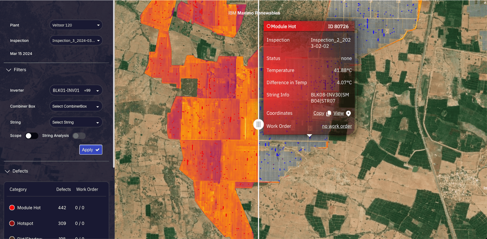 Mit einem vollautomatisierten Drohnendeck inspizieren Sie Ihre PV-Module regelmäßig per Thermografie. Die Aufnahmen werden in IBM Maximo Renewables importiert, strukturiert kategorisiert (z.B. Hotspots, Verschattung, Diodenfehler) und Wartungsaufträge direkt erstellt, für effiziente Instandhaltung Ihres PV-Portfolios.
